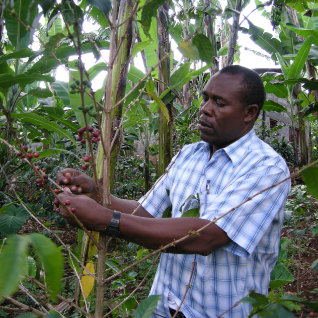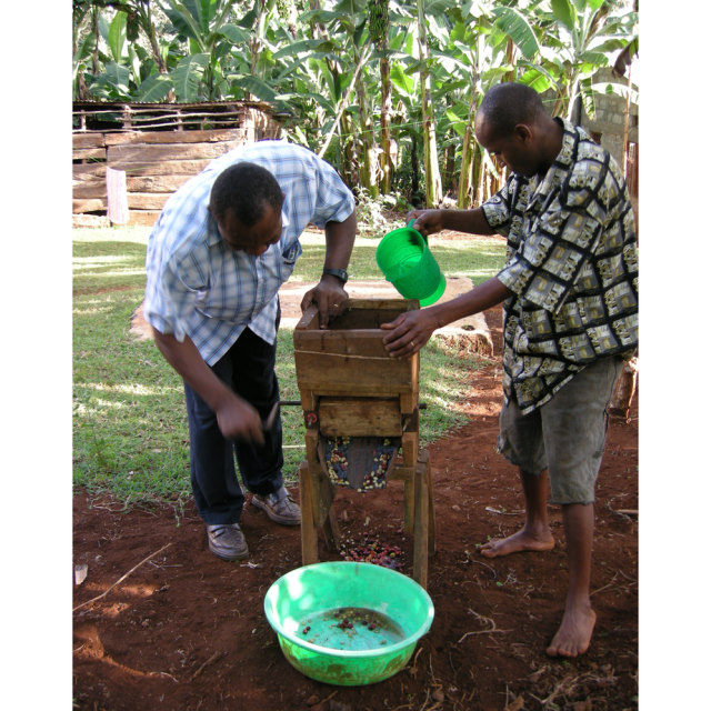 アフリカ大陸で最初に設立されたコーヒー生産者協同組合KNCU(キリマンジャロ先住民生産者協同組合)の生産者自らが、栽培、収穫、集荷、パーチメント加工、乾燥、脱穀、輸出まで取り組んでいます。小規模な生産者の多くがバナナをコーヒーのシェイドツリーとして活用するなど、他の作物との混植で栽培されています。品質保持のため、グレインバッグを麻袋の内側に使用して輸送されています。